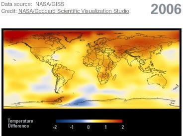 Figure 2. Using source data from NASA/GISS, this illustration shows the amount of change in global surface temperatures in 2006 from 1885.
