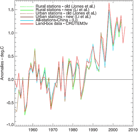 Figure 1. Annual average temperature anomalies. Jones et al (dotted green and brown) is a dataset of 42 rural and 42 urban sites. Li et al (solid green and brown) is an adjusted dataset of 42 rural and 40 urban sites. Li (blue) is a non-adjusted set of 728 stations, urban and rural. CRUTEM3v (red) is a land-only data set (Brohan et al., 2006). This plot uses the 1954–83 base period.