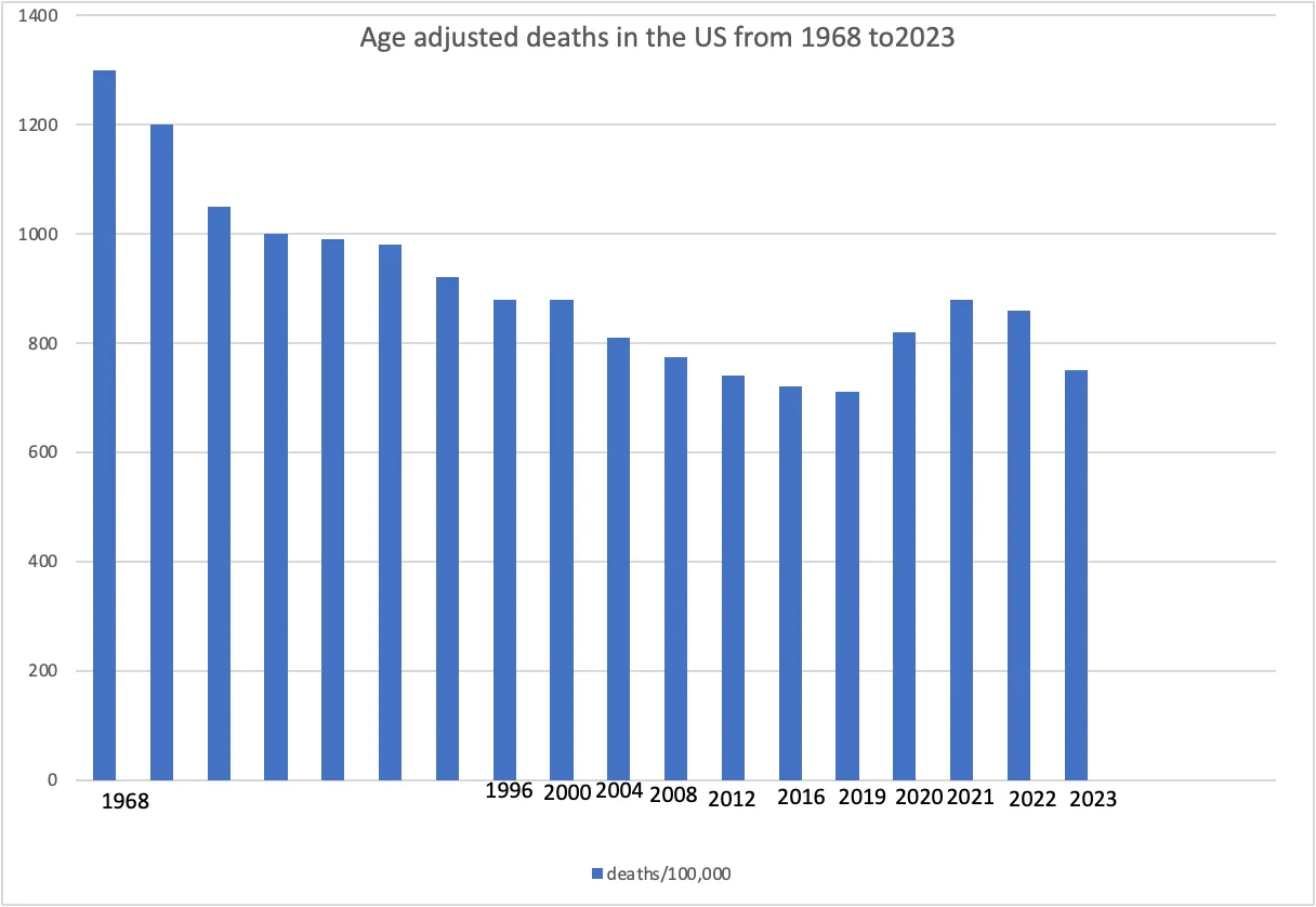 Placing 2021 on the graph below, for men and women combined, would be 674 deaths per 100,000. Placing 2022 on the graph would be about 668 deaths per 100,000 unadjusted for age, so possibly lower.
